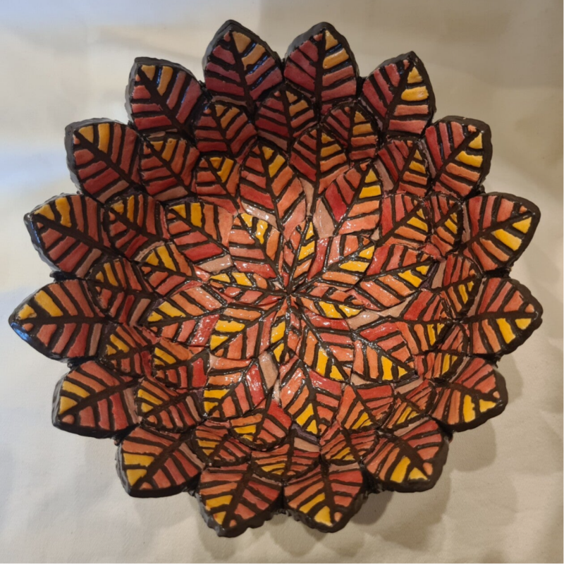 Deze keramieke schalen van zwartbakkende klei zijn opgebouwd uit een onderschaal welke gedecoreerd is met bladmotieven. Soms uitbunidg, soms meer ingetogen. Elk blaadje is afzonderlijk geglazuurd met verschillende kleurtinten glazuur.
