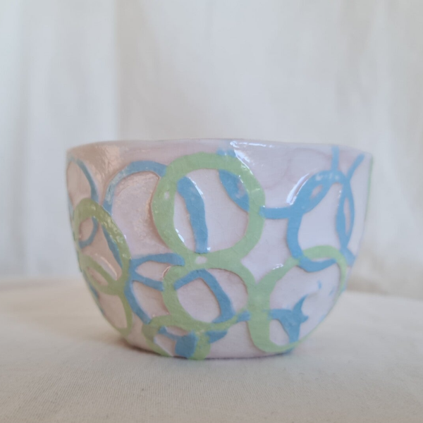 - Schaal Cirkels Blauw/Groen. Dit porseleine schaaltje is gegoten en daarna bewerkt met schellak en geleurd porselein slib. Door de schellakbewerking is er een relief ontstaan. Formaat: doorsnede 8,5 cm, hoogte 5,5 cm.