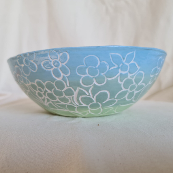 - Schaaltje Bloemen blauw/groen. Dit porseleine schaaltje is gegoten en daarna bewerkt met porselein slib. Formaat: doorsnede 15,5 cm, hoogte 5,5 cm.