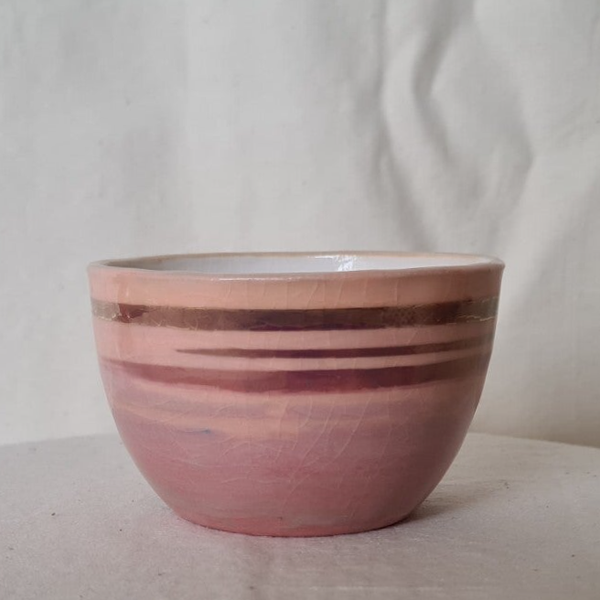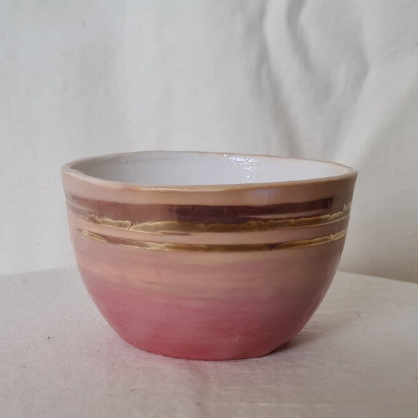- Schaaltje Pastel roze/rood. Dit porseleine schaaltje is gegoten en daarna bewerkt met porselein slib en goudluster. Formaat: doorsnede 8,5 cm, hoogte 5,5 cm.