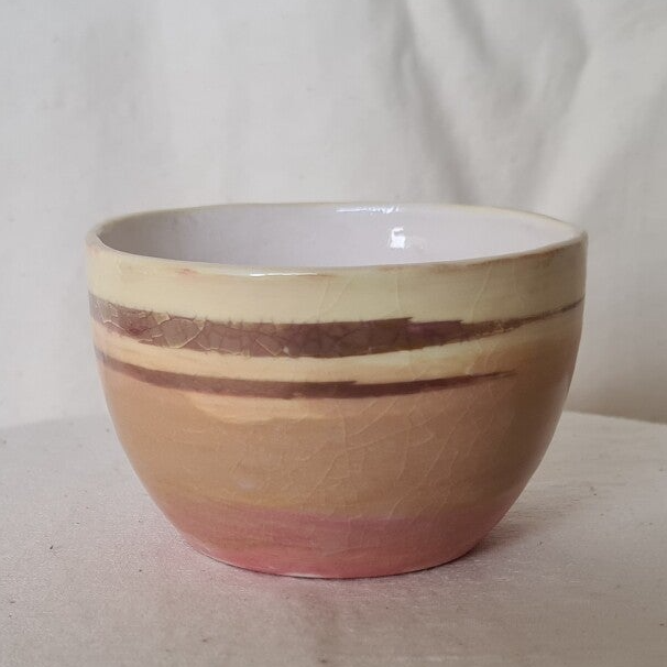 - Schaaltje Pastel geel/roze. Dit porseleine schaaltje is gegoten en daarna bewerkt met porselein slib en goudluster. Formaat: doorsnede 8,5 cm, hoogte 5,5 cm.