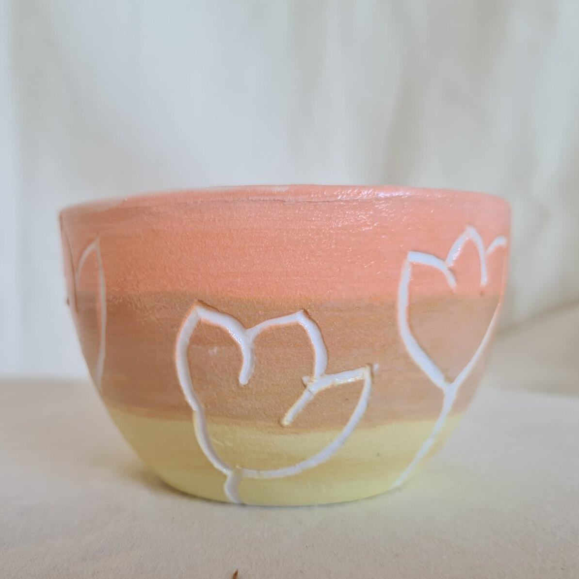 - Schaaltje Tulpen Roze/Geel. Dit porseleine schaaltje is gegoten en daarna bewerkt met porselein slib. Formaat: doorsnede 8,5 cm, hoogte 5,5 cm.