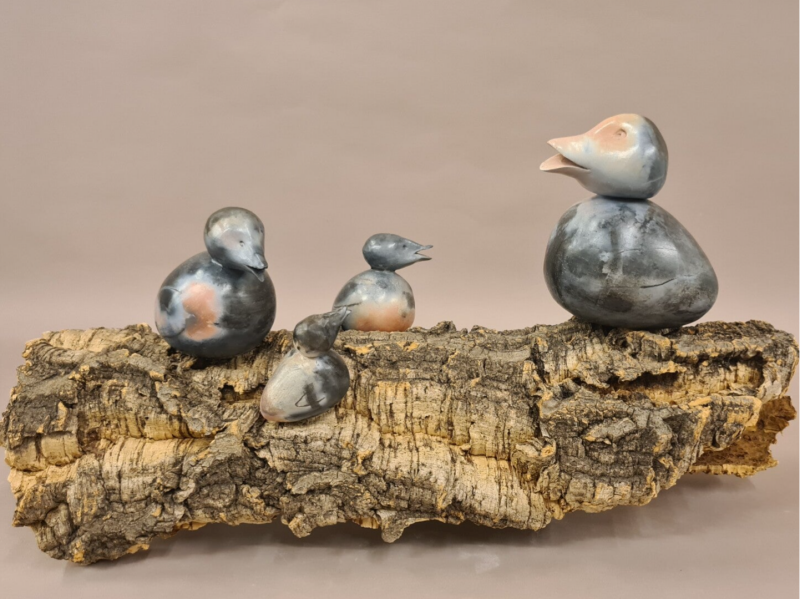Deze gestileerde, keramische eendjes zijn gemaakt van een witbakkende klei en vervolgens gepolijst en met de saggar techniek gestookt. Hierbij wordt geen gebruik gemaakt van glazuur, maar de objecten worden omwonden met organische materialen en metalen.