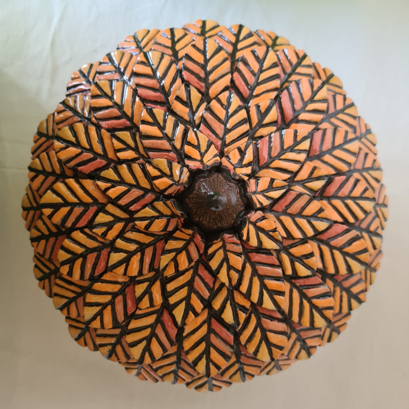 Deze ronde pot van 30 cm doorsnede bij 22 cm hoogte is gemaakt van zwartbakkende klei welke is geglazuurd met sinterengobes en transparant glazuur. De kleuren van de dekksel varieren van lichtgeel, via oranje naar rozerood. €300.