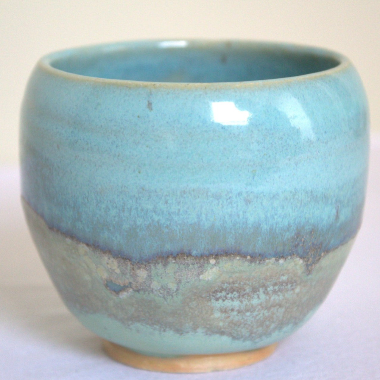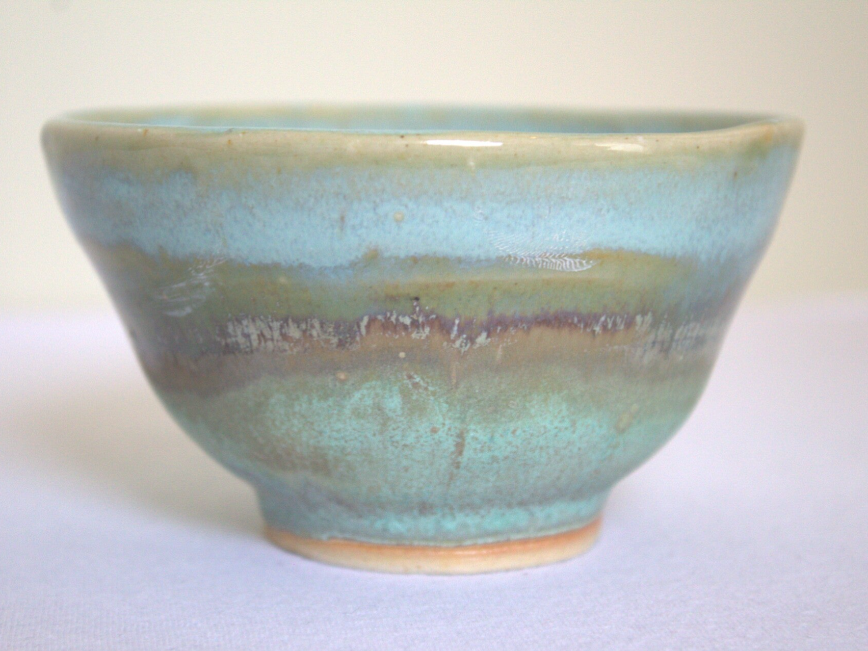 Deze gedraaide kommetjes van witbakkende klei zijn bewerkt met verschillende, gedeeltelijk overlappende, glazuren.