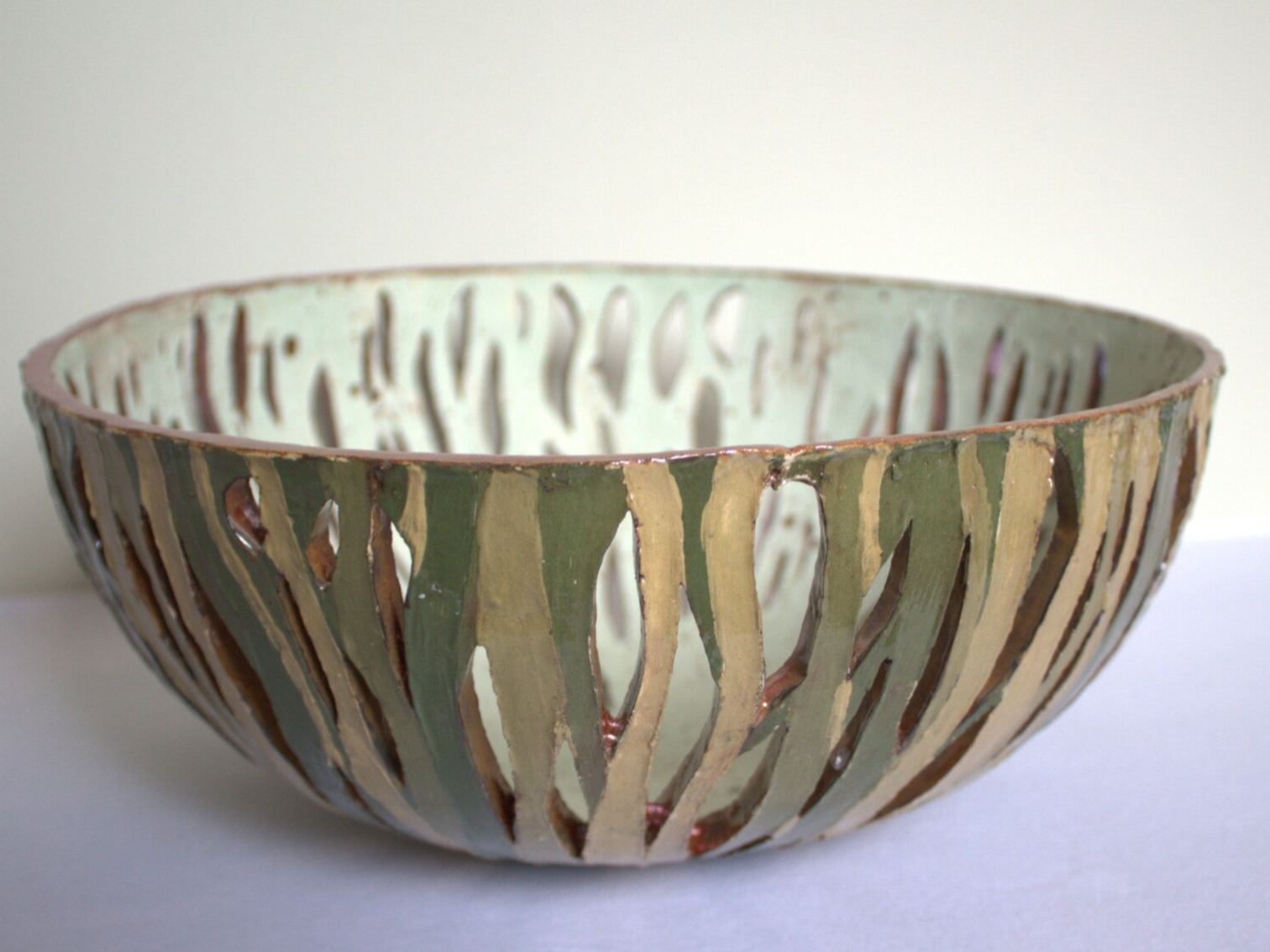 Een ronde schaal waarin allerlei insnedes zijn gemaakt. De schaal is aan de buitenzijde bewerkt met gekleurde engobes en aan de binnenzijde met sinterengobe en daarna bespetterd.