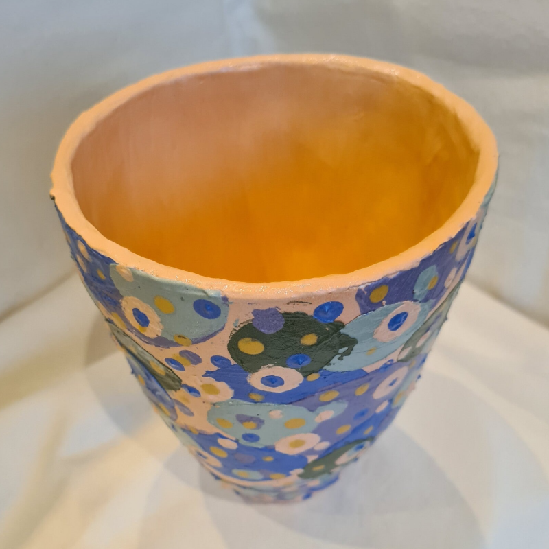 Deze keramieke vaas van witbakkende klei is bewerkt met verschillende tinten engobe, waaronder goud. Formaat: doorsnede 14 cm, hoogte 17 cm. €50.