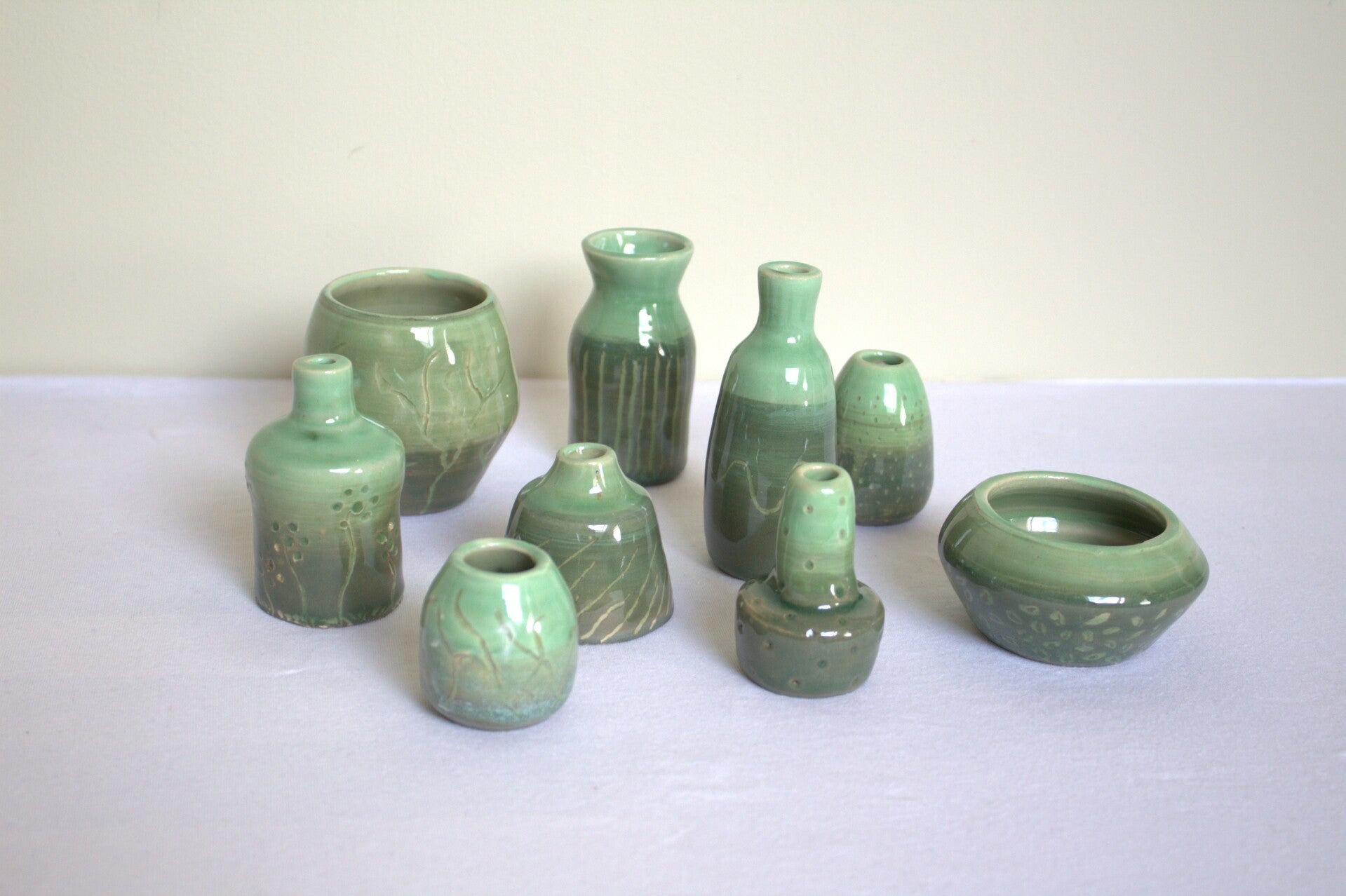 Deze kleine keramieke vaasjes zijn gedraaid van witbakkende klei en zijn bewerkt met engobes en ingekrast.